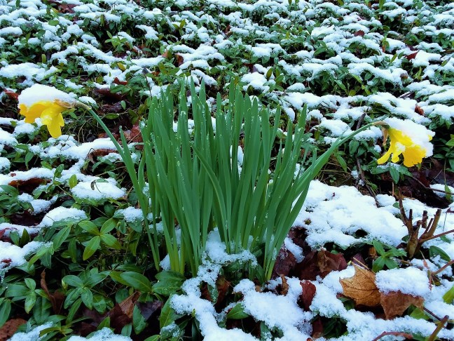We took these pictures of snowy daffodils last week, but we know that soon the cold weather will be a thing of the past.